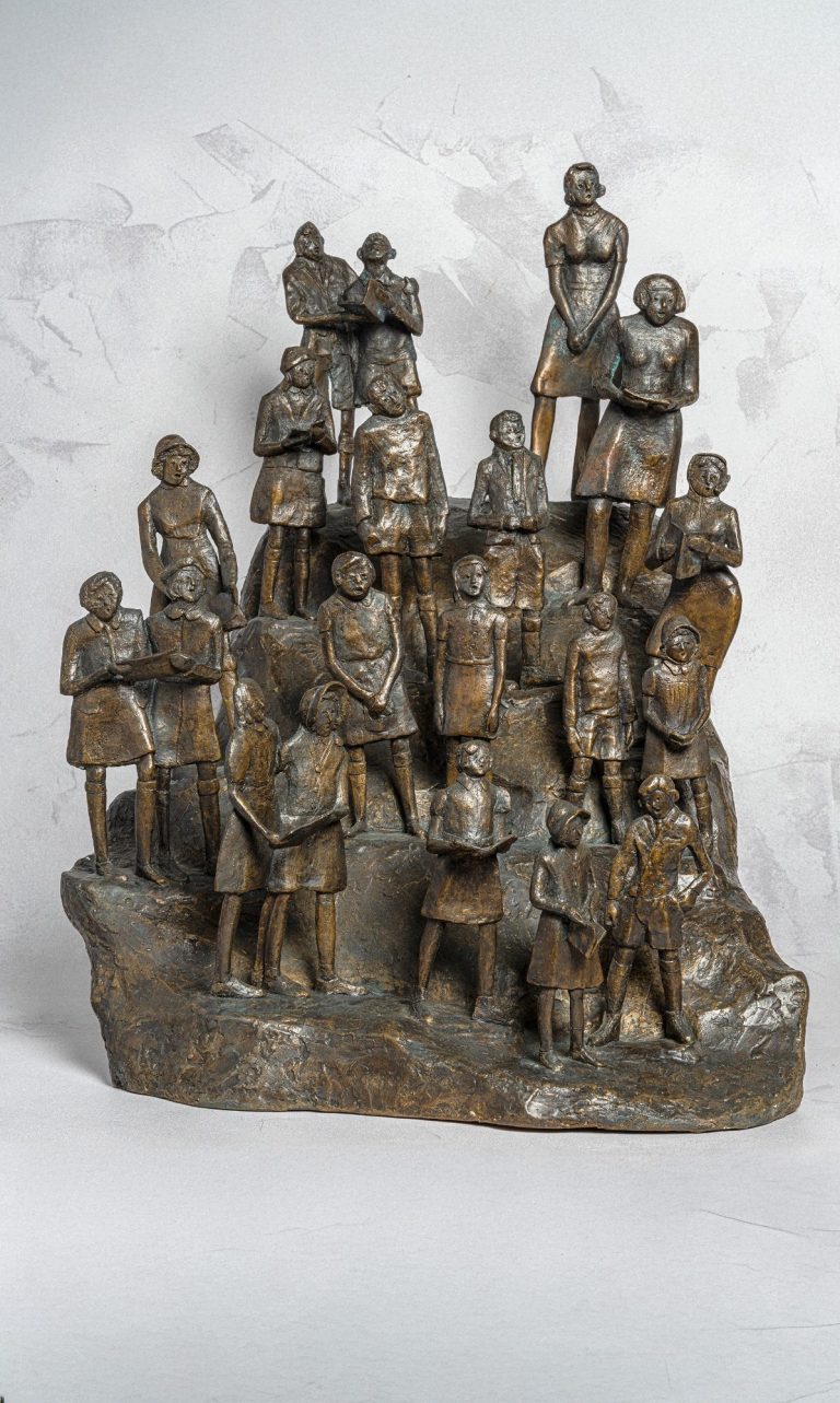 "This project began about 1980. Over several years I found ways of overcoming technical problems and raising funds for bronze casting.  It depicts a time about 1940.
